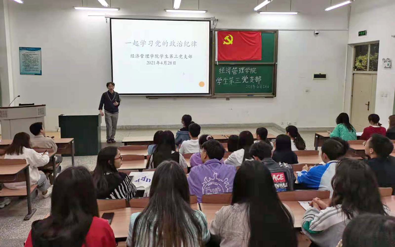 凝心聚力学党史,青春奋进正当时,为充分发挥青年党员生力军、突击队作用,2021年4月28日,在五四青年节到来之际,beat365官方网站学生第三党支部集中开展“学党史、强信念、跟党走”和“学习党的政治纪律,争做合格青年党员”主题党日活动。本次活动,结合支部实际情况,学习方式多样性,充分利用网络平台,采用线上线下相结合的形式组织开展。洋浦校区的党员、积极分子在博雅楼3104参加学习活动,昆师路校区的党员、积极分子通过腾讯会议收看学习,此次主题党日主旨在于带领广大青年党员从党史学习教育中汲取智慧和力量,让共产党员自觉接受党的纪律约束。