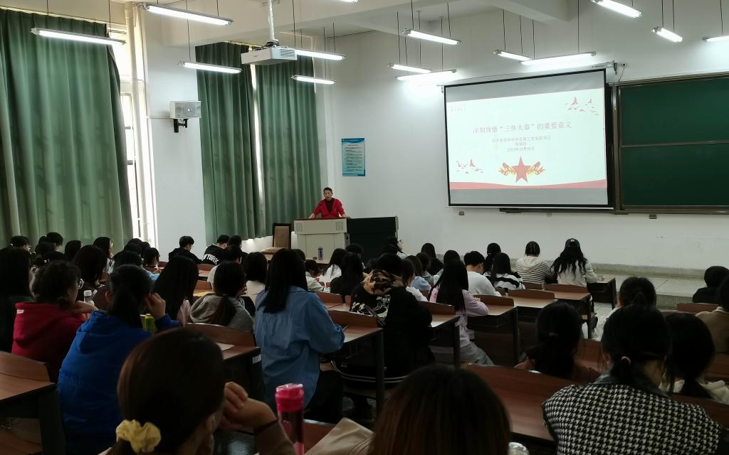学院党委副书记鲍鲲从“增、提、加、改、新、保、扩、促、深”9个要点解读了新时代、新征程中国共产党的使命任务,按照党的二十大报告中关于“实施就业优先战略,强化就业优先政策”等有关要求,结合当前大学生就业的最新政策和学院学生目前就业创业工作实际,分析当前就业形势,提出同学们在校期间应不断加强自己的专业能力、提升综合素质,为走出校门、走向社会做好准备。