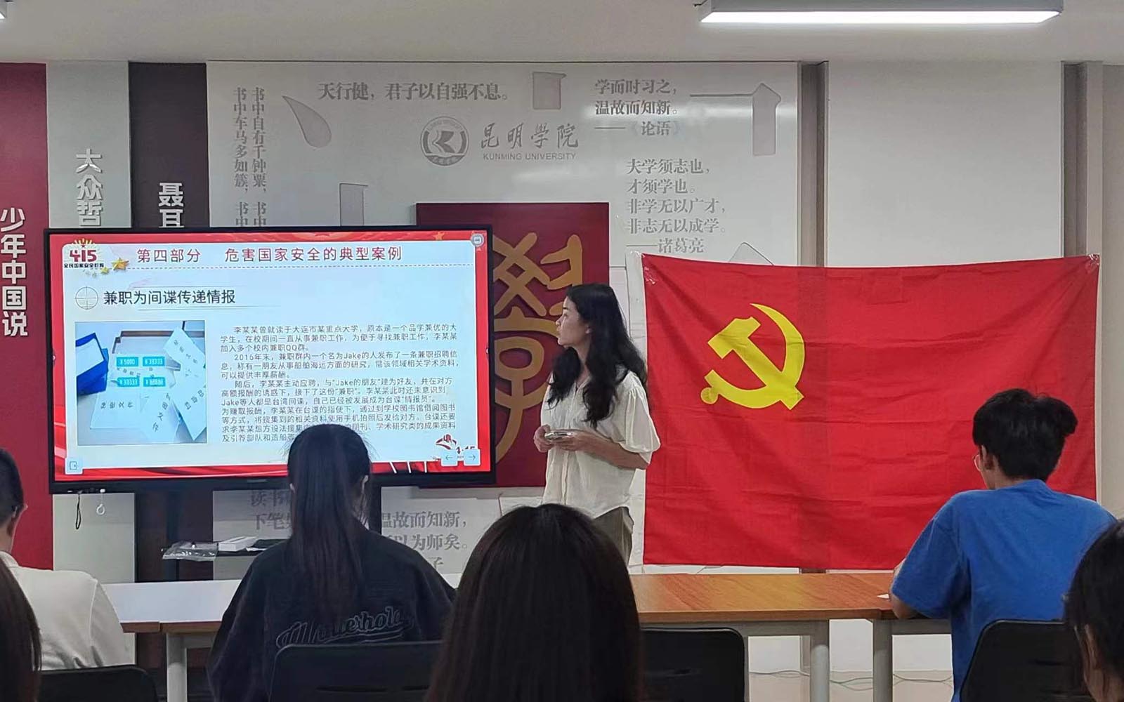 支部书记徐天琴讲解了习近平总书记提出的新时代总体国家安全观以及维护国家安全的义务和责任,让青年学生认识到,国家安全与我们每一个人息息相关。此外还展示了一些危害国家安全的典型案例,活动中还播放了支部成员自主拍摄的关于国家安全介绍的视频短片,他们表示希望能通过微薄之力汇聚时代力量,让更多人听见青年的声音,共筑国家安全防线。