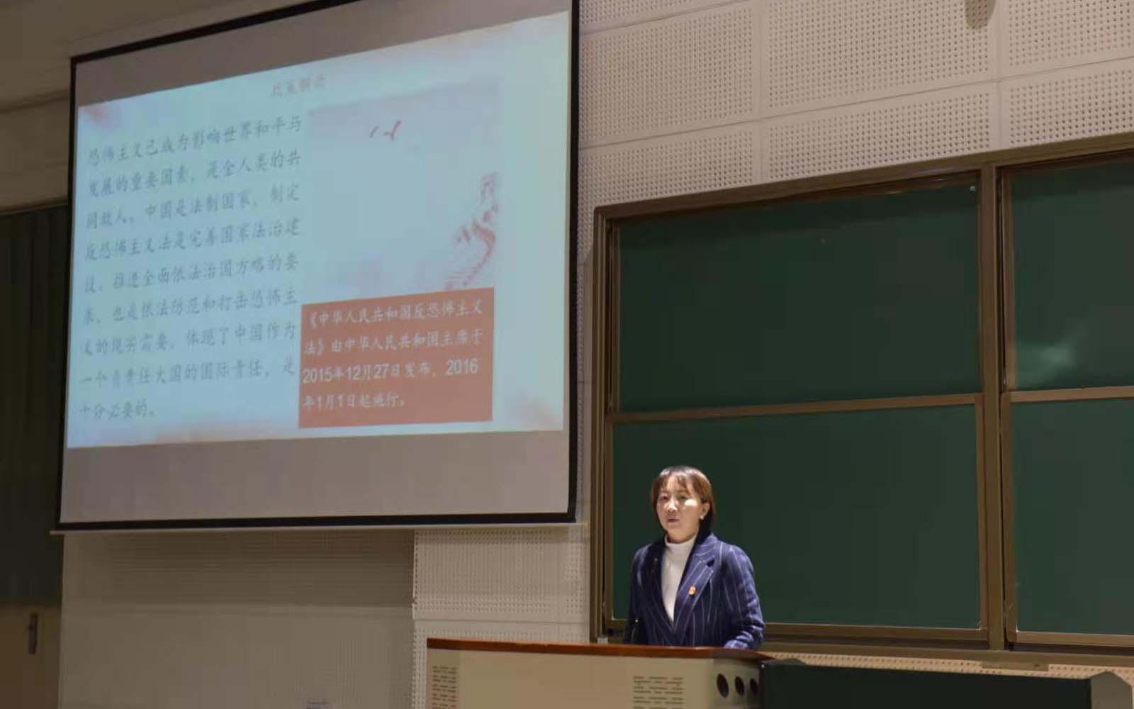 鲍鲲老师先向大家介绍了当今世界的反恐形式,向同学们普及了我国相关的法律条文,结合现实的例子加深同学们对于反恐知识的印象。呼吁同学们要知法、懂法、学法,学会用法律保护自己。